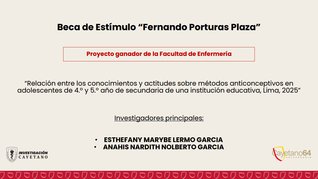 Durante la ceremonia se hizo entrega de la Beca de Estímulo “Fernando Porturas Plaza” a las estudiantes Esthefany Lermo y Anahis Nolberto, de la carrera de Enfermería, por el proyecto “Relación entre los conocimientos y actitudes sobre métodos anticonceptivos en adolescentes del 4to y 5to año de secundaria de una institución educativa, Lima, 2025”. Reconocimiento que fue entregado por el Dr. Pedro Saona, decano de las facultades de Medicina, de Estomatología y de Enfermería.