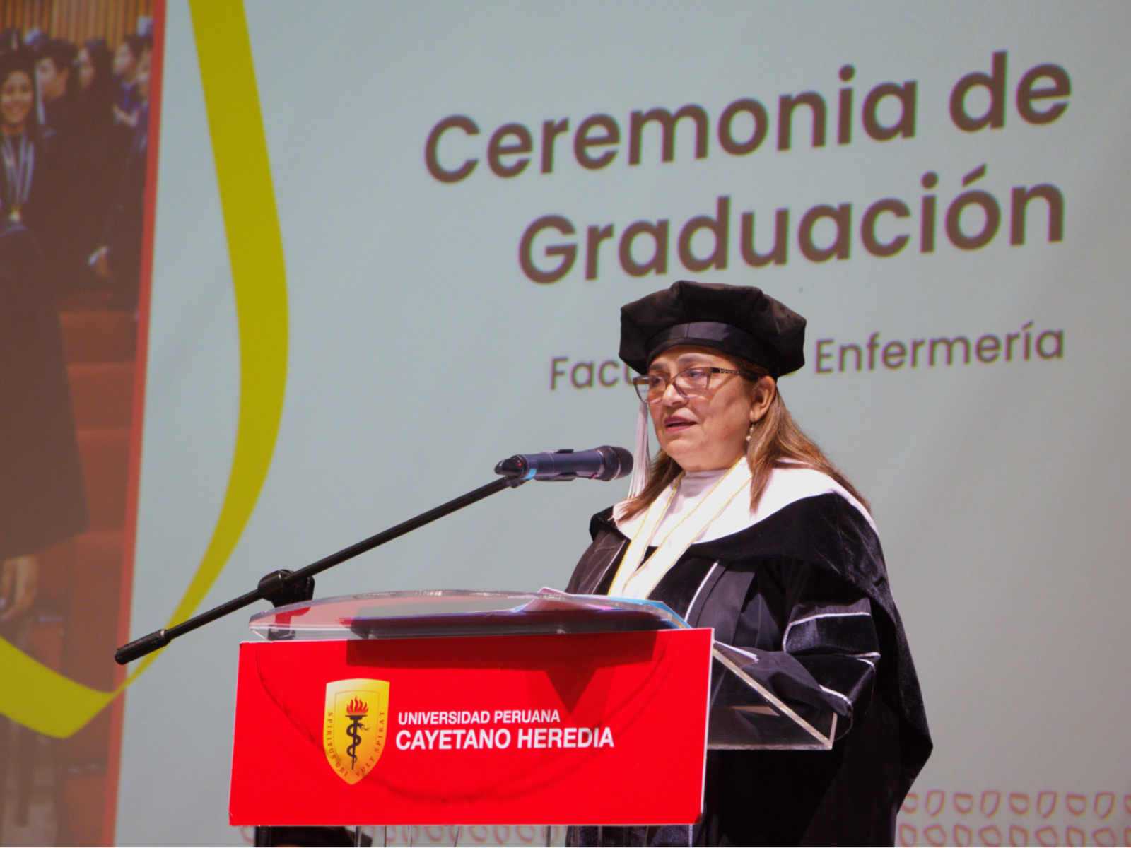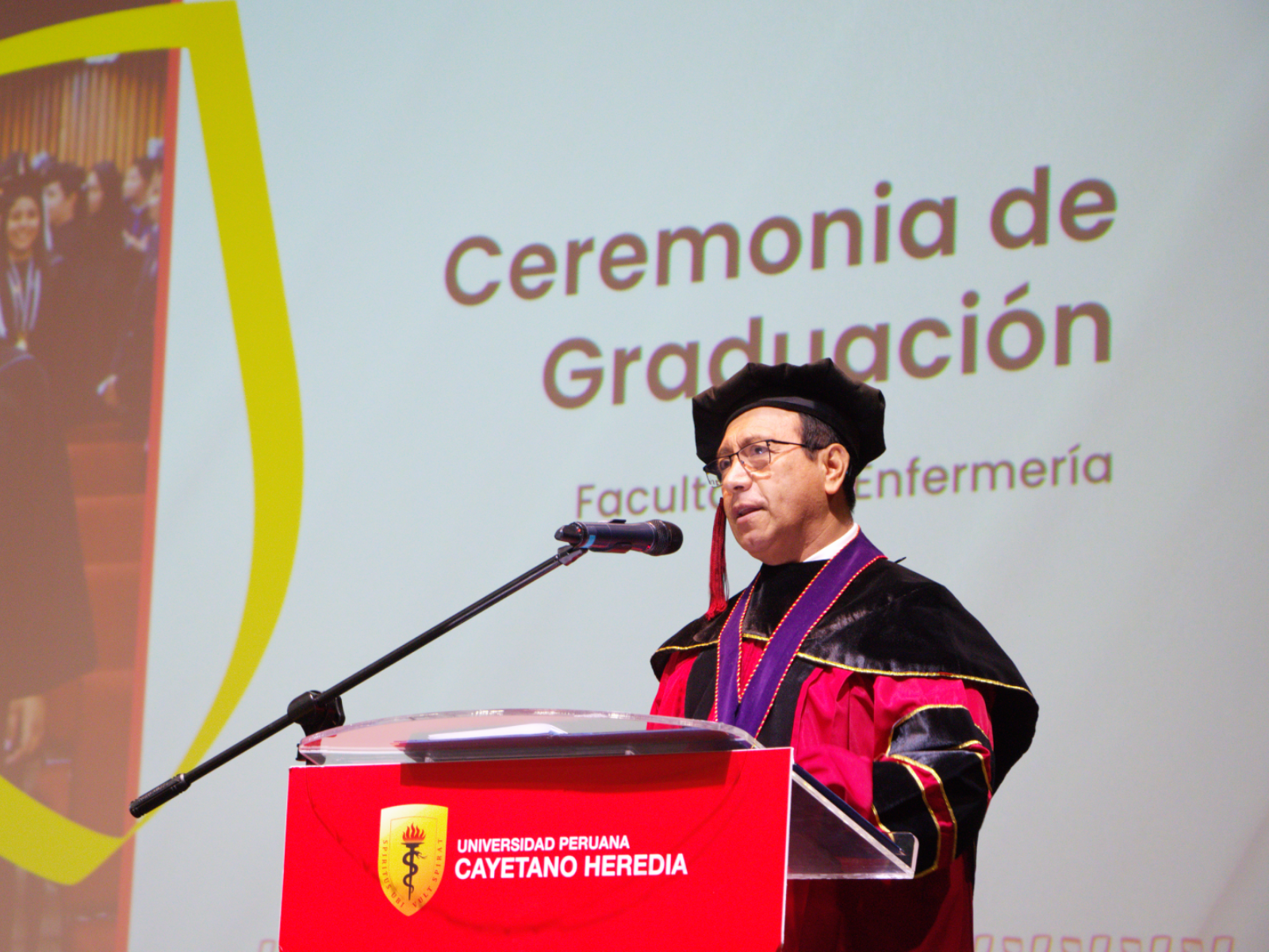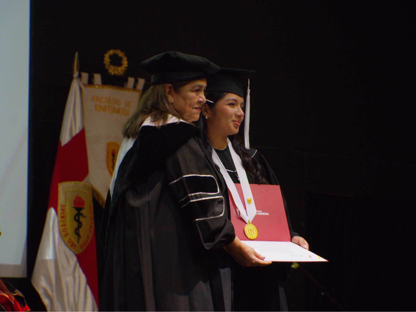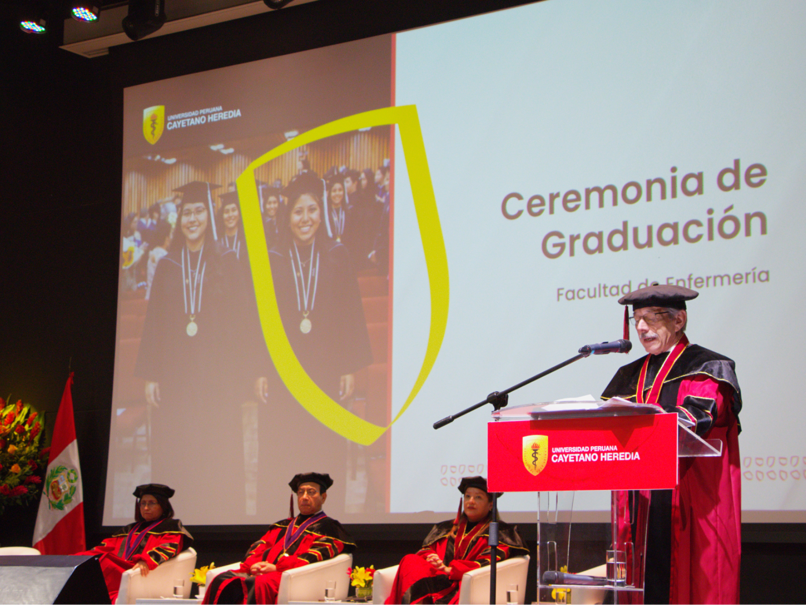 La ceremonia contó con la presencia de nuestras principales autoridades: el Dr. Enrique Castañeda Saldaña, Rector de nuestra universidad; la Dra. Yesenia Musayón Oblitas, Vicerrectora Académica; la Dra. Geraldine Salazar Vargas, Secretaria General; el Dr. Pedro Saona Ugarte, Decano de las Facultades de Medicina, de Estomatología y de Enfermería; y la Dra. María Ángela Fernández Pacheco, Vicedecana de la Facultad de Enfermería, quienes acompañaron a los graduandos en este momento significativo.