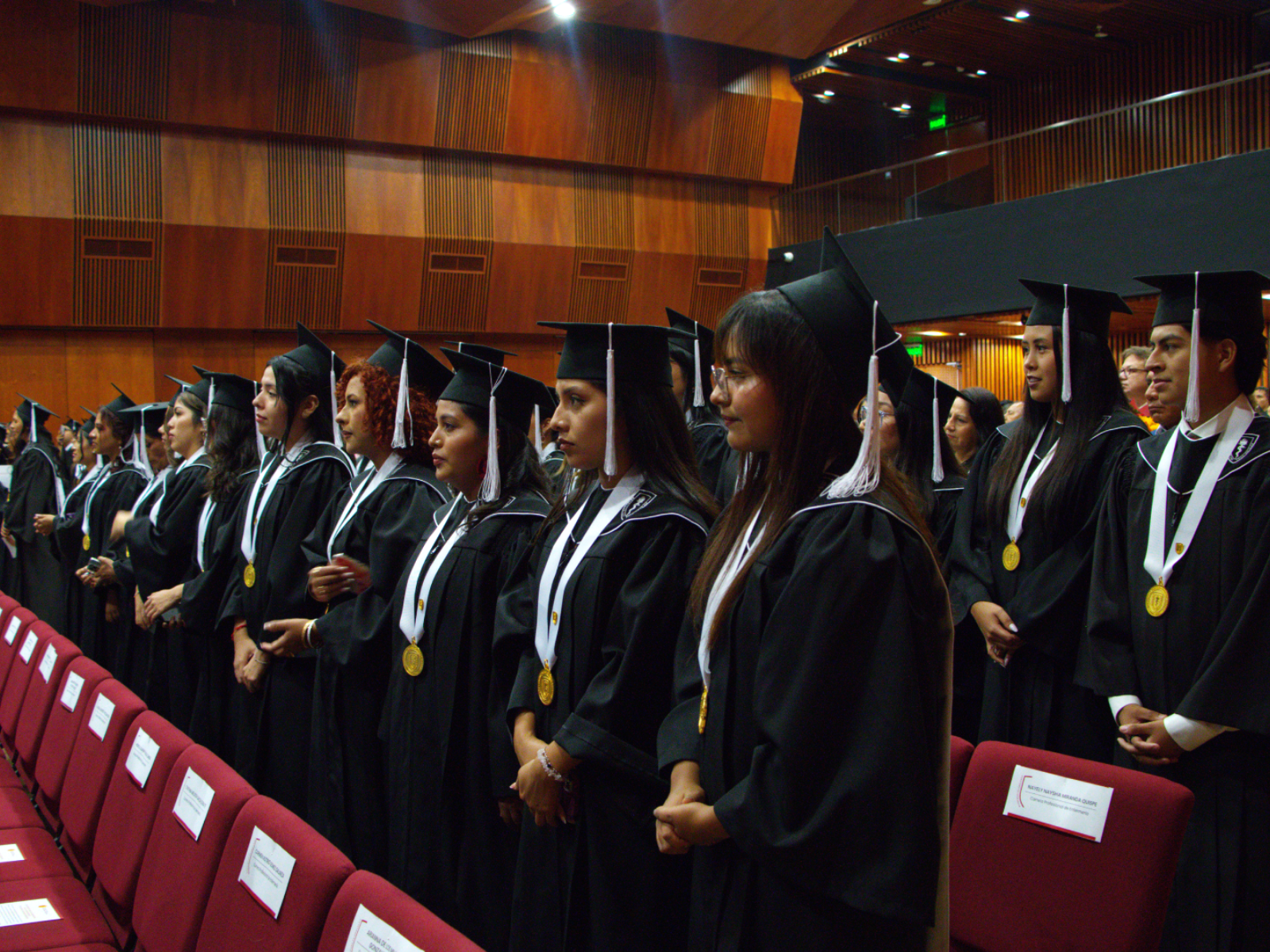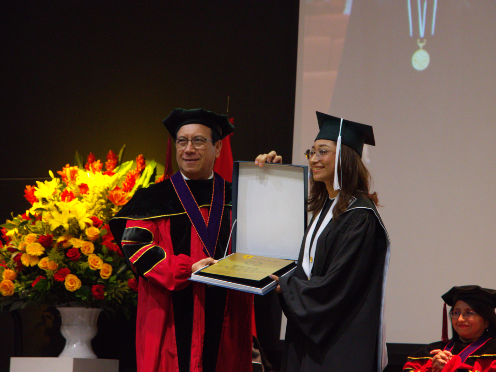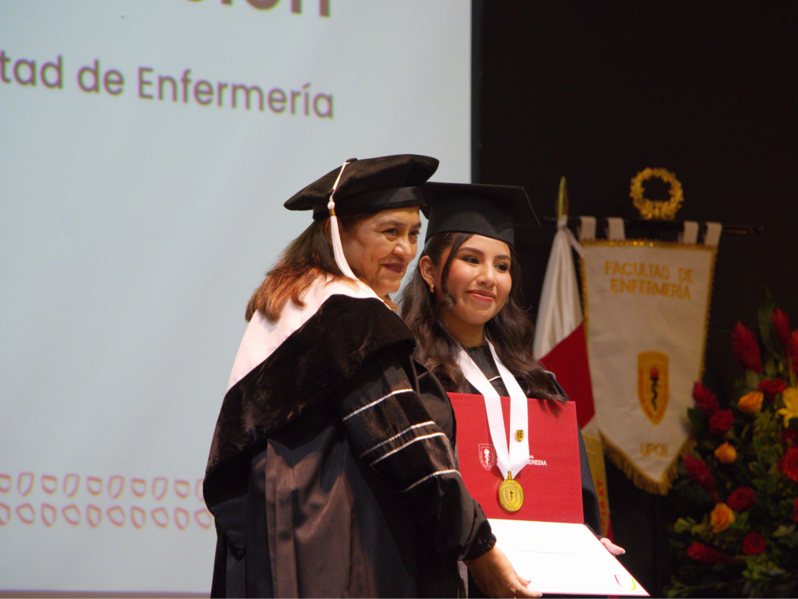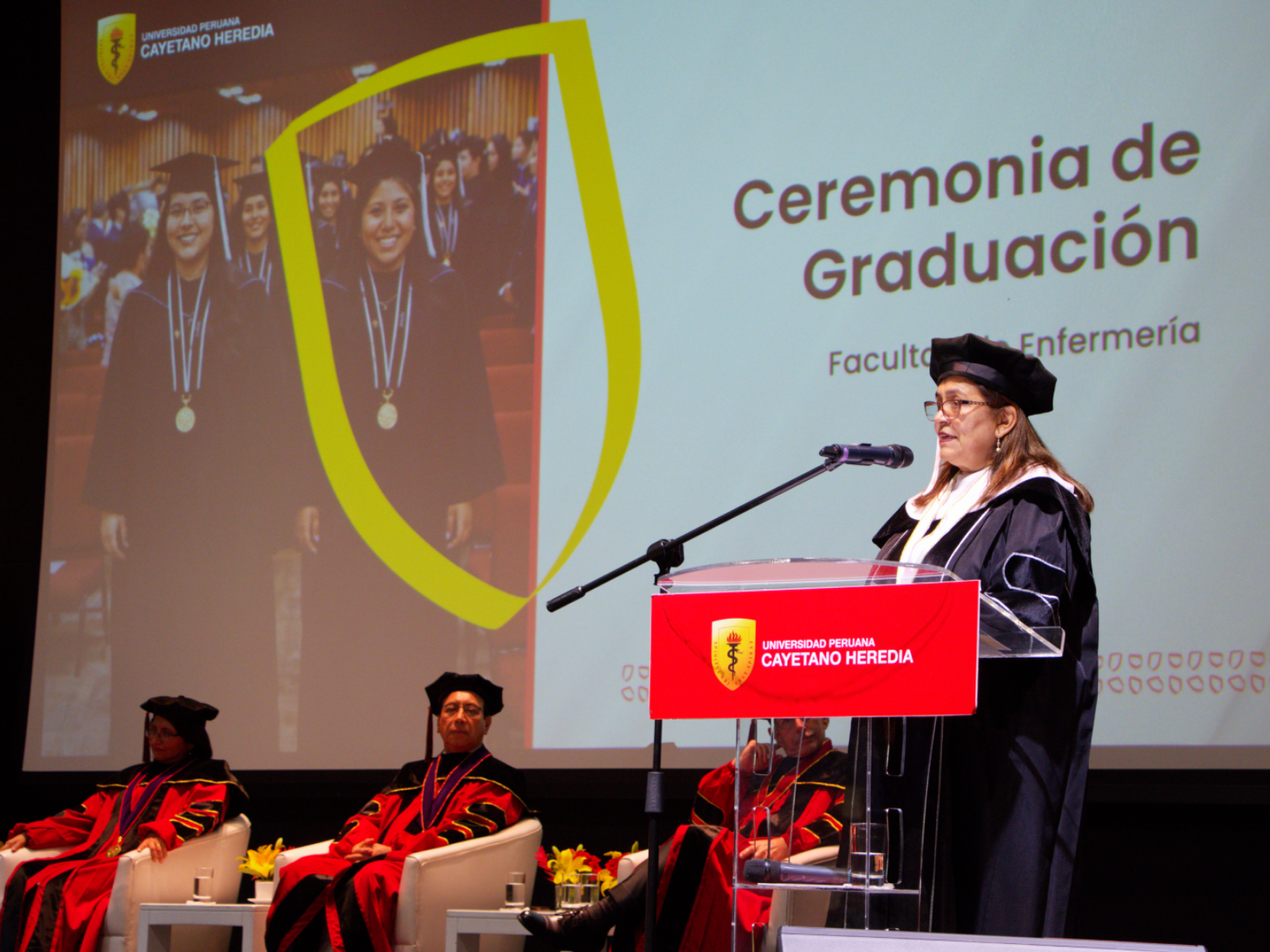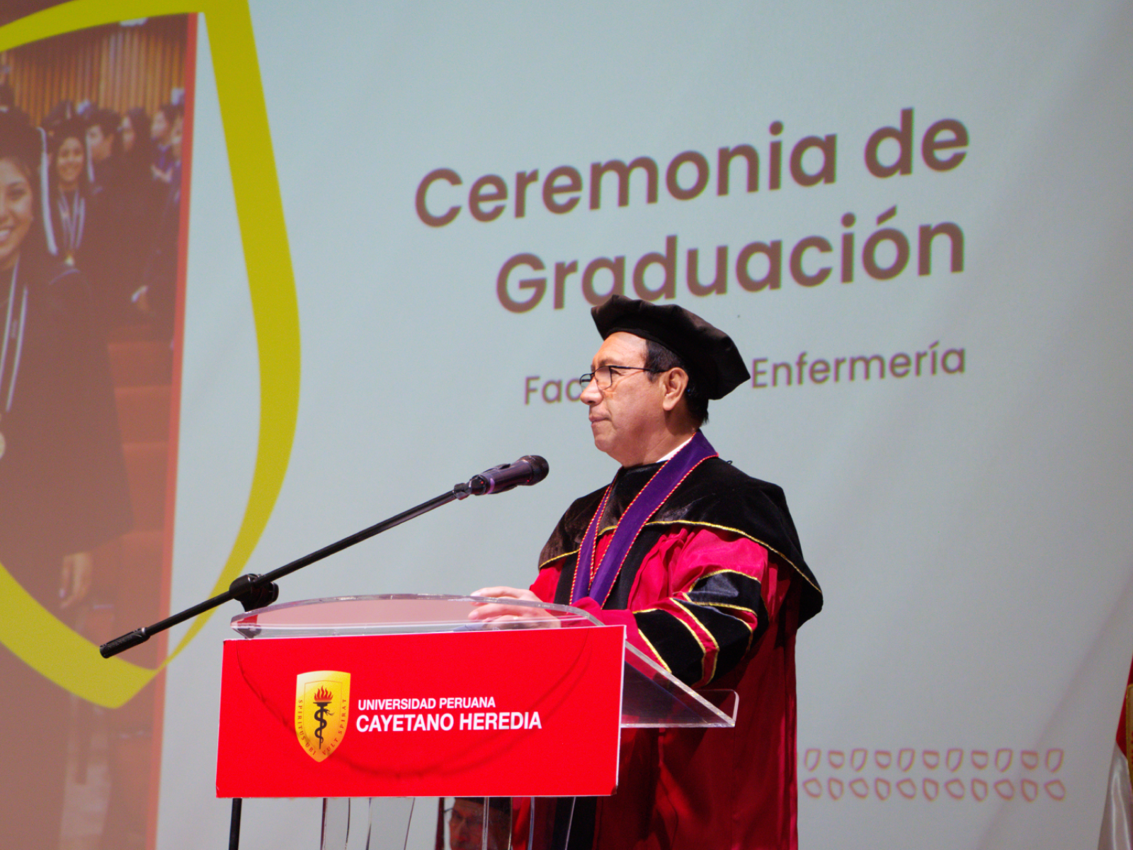 La ceremonia contó con la presencia de nuestras principales autoridades: el Dr. Enrique Castañeda Saldaña, Rector de nuestra universidad; la Dra. Yesenia Musayón Oblitas, Secretaria General; el Dr. Pedro Saona Ugarte, Decano de las Facultades de Medicina, de Estomatología y de Enfermería; y la Dra. María Ángela Fernández Pacheco, Vicedecana de la Facultad de Enfermería, quienes acompañaron a los graduandos en este momento especial.